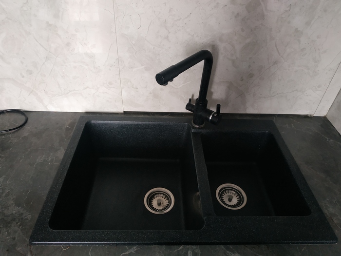 Мойка GranFest PRACTIK GF-P780K. Особенность этой мойки в том, что она имеет две неравные по габаритам чаши (45 и 35см). В малой чаше можно сушить посуду или размораживать продукты, а в большой спокойно мыть посуду. Я пользовалась подобной мойкой, но с одинаковыми чашами, в итоге они обе совершенно бестолковые, в одной пусто, в другую ничерта не влазит.