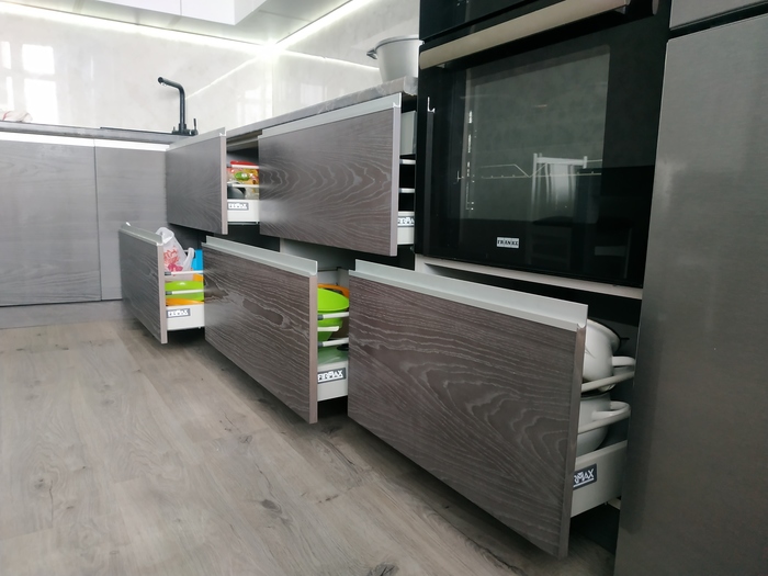 Одним из моих пожеланий на этой кухне было хранение в выдвижных системах. Очень комфортно, открывая ящик видеть всю утварь, бытовые приборы, специи и прочее барахло. У мня получилось 6 выдвижных ящиков - 5 внешних и один внутренний под барахло. В быту получилось, что 4 забитых шкафчика 850мм, и все они тихо и плавно закрываются и доводятся.