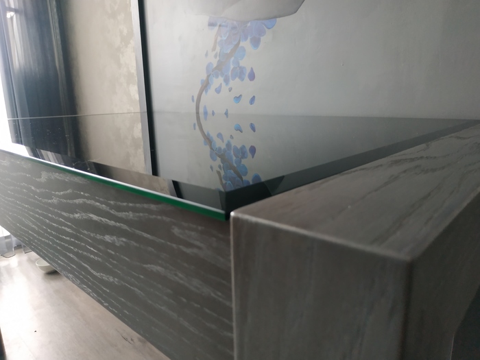 Изначально планировали установит каленое стекло, но в последний момент нашли неплохой широкоформатный керамогранит 80*80см. Были приглашены, как оказалось, рукожопы, которые запороли все торцы при подрезке по высоте, и теперь необходимо брать пристенный бортик чтобы закрыть эту порнографию. Как альтернатива пристенному бортику, планирую приобрести просто алюминиевую планку, и проклеить ей щель у столешницы.