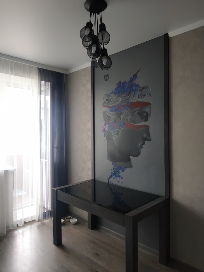 Панно рисовала наша подруга, и уже год я не могу наглядеться на него. Очень радует глаз и украшает комнату.