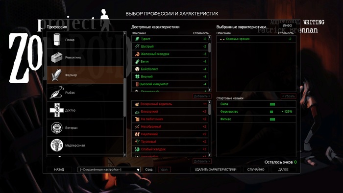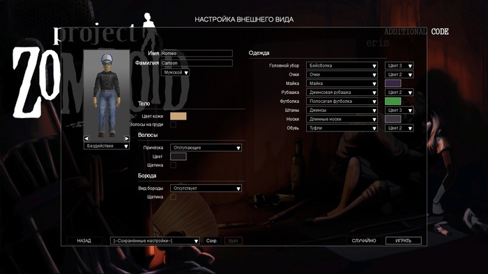 Профессий тут много. У каждой свои преимущества, но я решил взять обычного фермера и добавить кошачье зрение. Конечно же, вам нужно будет десять раз подумать какую профессию выбрать и какие навыки дать. Сделали всё? Тогда игра предлагает вам настроить вид вашего персонажа. Можно сделать себя, или же просто нажать на "рандом"