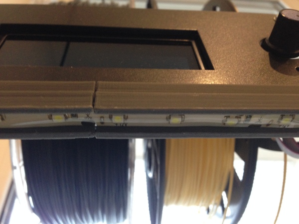 Подсветка из светодиодной ленты. В какой то момент надоело включать свет, для контроля печати. В дальнейшем планирую закрепить камеру и подключить к принтеру Raspberry PI, для удаленного наблюдения и отправки моделей в печать без передергивания флешки.