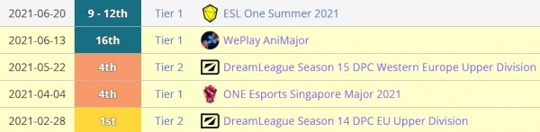 То, что команда может побеждать на тир-1 уровне, она доказала еще в первом сезоне DPC, заняв первое место на DreamLeague Season 14 DPC EU: Верхний дивизион — лиге, которую считали самой конкурентной. Четвертые места на ONE Esports Singapore Major 2021 и втором сезоне DPC позволили Европа Team Secret обеспечить себе путевку на The International 2021 и готовиться к нему в удобном темпе.