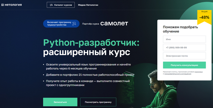 Python-разработчик с нуля от Нетологии – углубленный курс переподготовки с программой трудоустройства.