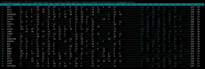 3. В этом примере мы видим, что в течение месяца почти каждый второй день ровно в 19:00 по Москве монета AIDOGE (это старая табличка) подпрыгивает на 1-2 процента вверх всего лишь на пару коротких минут, и такая статистика даёт нам возможность «поиграть в угадайку» с большой вероятностью получения профита. Также здесь мы видим периоды самого активного роста монет и периоды «самого спокойного спокойствия» на рынке.