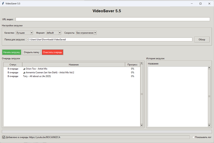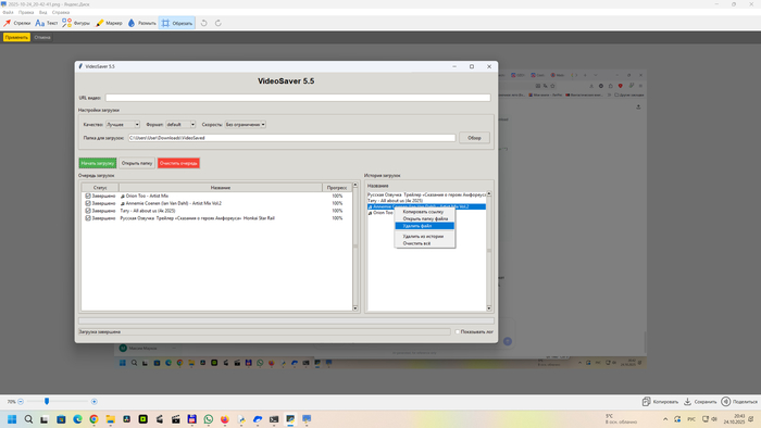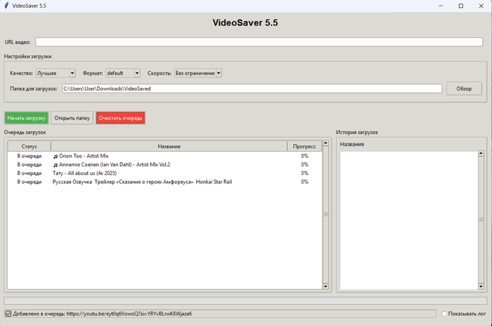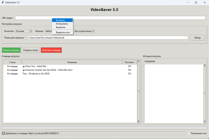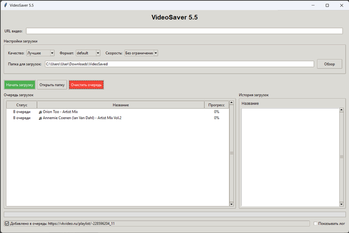 Поменян интерфейс и способ ввода, сейчас в поле нужно нажать, выбрать вставить - автоматом начнётся определение названия и корректного адреса. Для плейлистов ( 100% работает в ВК ) при обнаружении открывается отдельное окно выбора, где можно отметить нужное, формат - видео+аудио ( по умолчанию оба чекбокса ) или одно из двух. В истории загрузок правой кнопкой можно управлять, очистить историю, удалить файл, открыть с ним папку или скопировать адрес для повторной загрузки. Сделано для удобства , так как для плейлистов создаётся отдельный подкаталог в который и идёт загрузка. Для ютуб применена схема обхода, вроде-бы даже не используются браузеры, он думает что идёт стриминг, но качество выше 1080 не удалось вытащить. Названия из него получаются подменой юзер-агента на мобильный браузер. Ротации кукисов сейчас нет, но функционал просто удалил из интерфейса и оставил в самой программе, вдруг потом пригодится. И да, привязка к браузеру осталось у вк, но там идёт проверка через реестр, поэтому вернее всего будет ругаться антивирус. ffmpeg + ffprobe обязательны в каталоге с программой, не стал их в архив включать и выпилил автоскачивание. Прогресс-бар иногда дёргается из-за фрагментации потоков, к которым он жёстко привязан, но я не считаю это критичным. Что-то ещё делал по мелочам, но позабыл, старость сказывается.