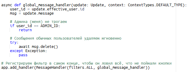 Отдельная фишка, которой горжусь — «Режим тишины». Я сделал так, чтобы пользователи не могли спамить в чат бота текстом или стикерами. Бот просто удаляет всё лишнее, оставляя только красивый интерфейс.