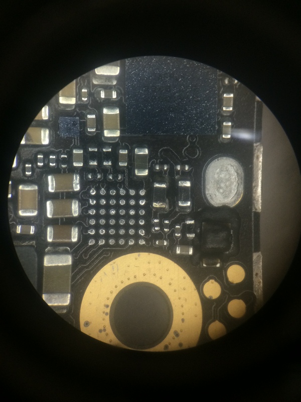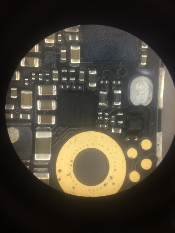 Проверяем на коленке и вроде бы все замечательно, но не заряжается, компьютером не определяется. Поэтому снимаем микросхему Q2, чистим, видим что она треснутая, будем ставить с донора.