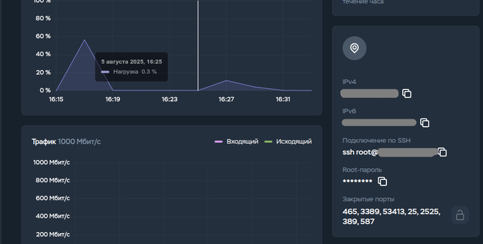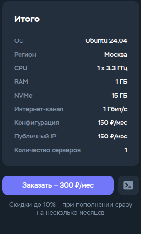 Если отключить бекапы (они в нашем случае не нужны, сервак можно легко и просто развернуть заново), то, выходит, всего 300 рублей в месяц. После непродолжительного создания самого виртуального сервера у нас будет IP и пароль. После чего можем начать конфигурировать его по ssh.