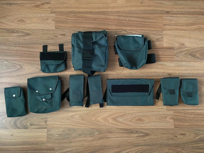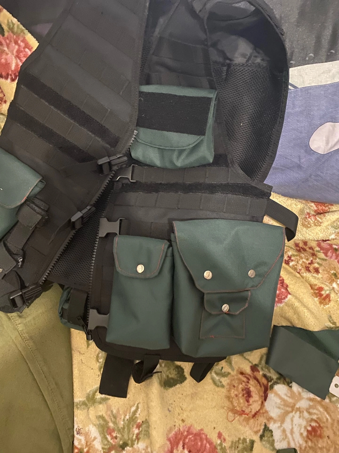 по костюму он сшил штаны, куртку, жилет, подсумки, крепления и ещё по мелочевке. Перчатки и налокотники с наколенниками были куплены в специализированных магазинах и окрашены в нужный цвет.