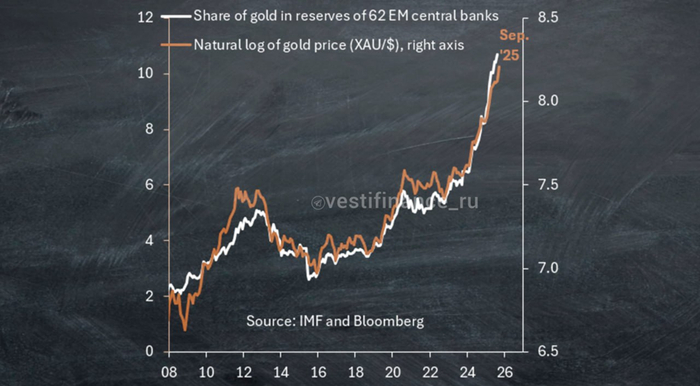 “Приведенная выше диаграмма постоянно используется для утверждения, что за безумным ростом цен на золото стоят центральные банки. На левой оси показана доля золотых запасов (белая линия) в общих резервных активах 62 центральных банков развивающихся рынков. Резервные активы состоят в основном из долларов, других твердых валют и золота. На правой оси показан натуральный логарифм цены золота XAU/$ по данным Bloomberg (оранжевая линия).