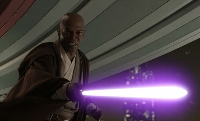 Сначала выходят «Звездные войны: Эпизод 1», где Сэмюэлю достается роль Мейсу Винду с тем самым уникальным мечом.