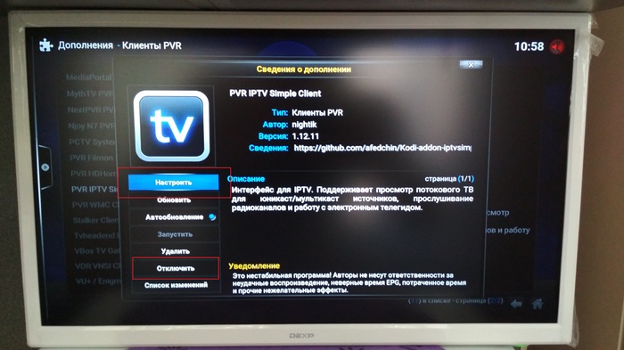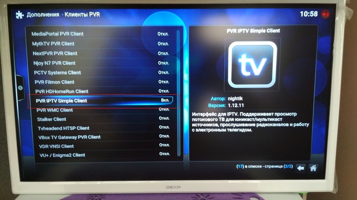 После нажатия ок мы будем перенаправлены на страницу с клиентами PVR(возможно придётся чуточку подождать). Нам требе PVR IPTV Simple Client. Включаем его и жмём настроить.