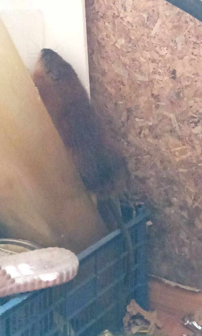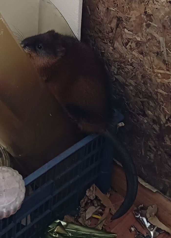 Слышим шум в «сенях» (У нас есть карман при входе в дом. Он не отапливается, и мы его используем как кладовку-холодильник-морозильник, в зависимости от времени года). Женя выходит посмотреть на источник шума. Заходит домой и говорит, что у нас в сенях сидит ондатра. Мы были удивлены. Обычно прямо в дом они не заходят. Максимум где-то в районе летней кухни они появляются. В прошлом году именно там мы с ней и виделись в последний раз. Не конкретно с этой особью, хотя всё возможно.