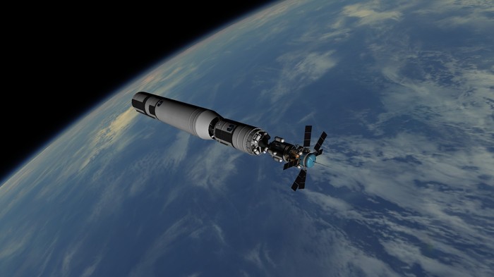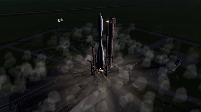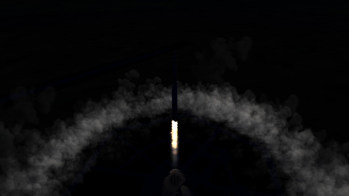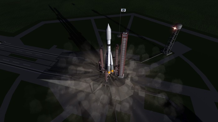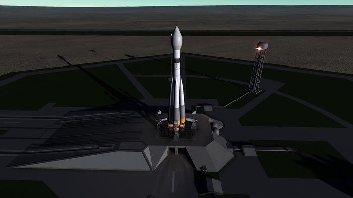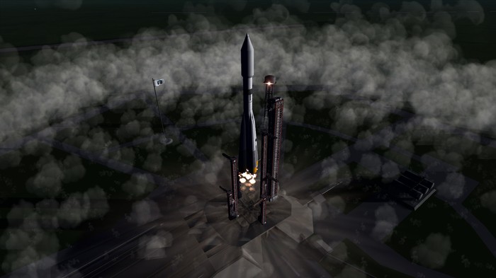 Вечер. Небольшая группа из 5 инженеров везут ракету к старту. Здесь она будет стоять до завтра.