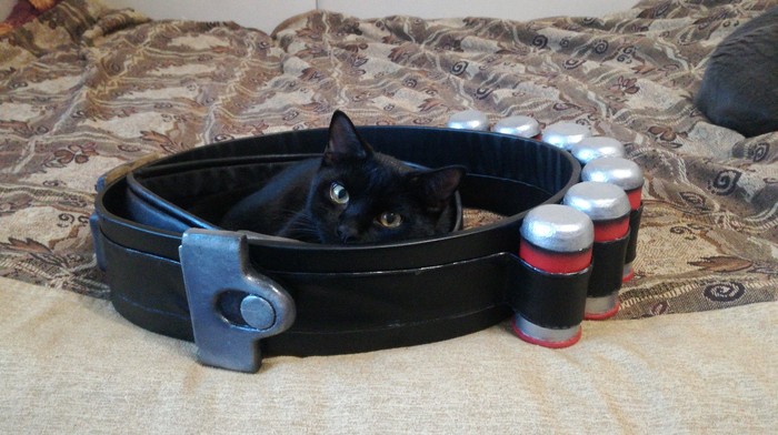 Теперь перейдем к деталям, которые были созданы иначе. Ремни на поясе были созданы из мягкой евы 35шор 3мм и обтянуты нео-кожей (эластичный кожезам). Для начала на основу по центру была пришита декоративная полоса, что держит гранаты на нижнем поясе. Затем чехол сшивался и натягивался на уже подготовленный кусочек евы. Поверх по краям прошивка. Бляшки и декоративные детали изготовлены из евы и обтянуты Ворблой. Чтобы гранаты не соскользнули, я добавила по капельке клея на каждый кармашек. Ремни для нагрудника были изготовлены чуть проще, прошивка была сразу по еве, так как ремешки небольшие.