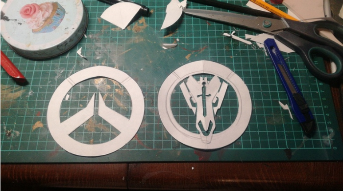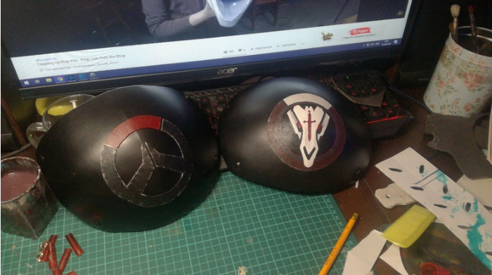 Далее перейдем к самой простой части костюма. Наплечники. Основа была сделана из евы и обтянута нео-кожей. Эмблемы я рисовала и вырезала из 1мм евы. После красила и просто приклеила к готовому обтянутому плечу.