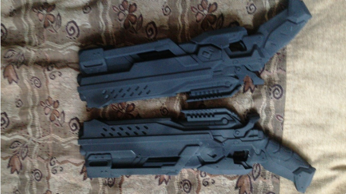 Модель пушек мы заказали у знакомого, со всеми мельчайшими детальками. Затем печать осуществлялась у другого знакомого. Первый вариант пушек сначала нас устраивал, но в итоге при сборке всего костюма, мы поняли что они маленькие. При этом всем, сборка, шлифовка и грунтовка, а так же частичный покрас уже был на них сделан…