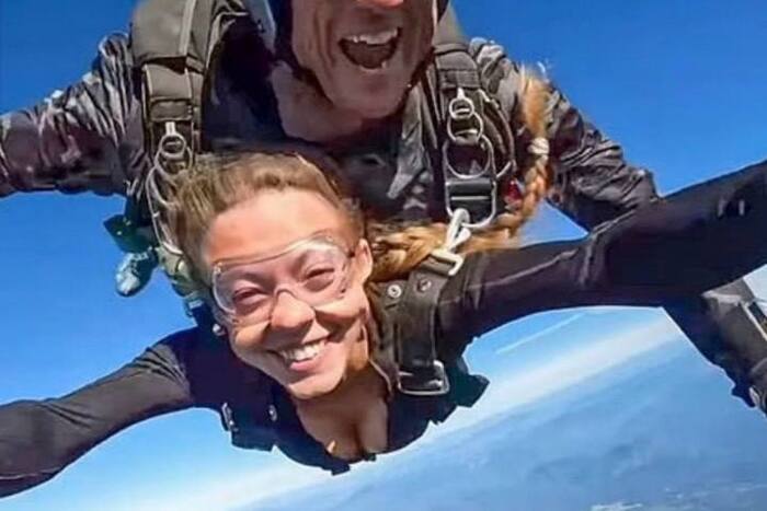 Актриса Сидни Суинни спрыгнула с парашютом с высоты 3.000 метров вместе с членом команды Red Bull Air Force Люком Эйкинсом.