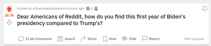 Дорогие американцы Реддита, что вы думаете о первом годе президентства Байдена в сравнении с первым годом Трампа?