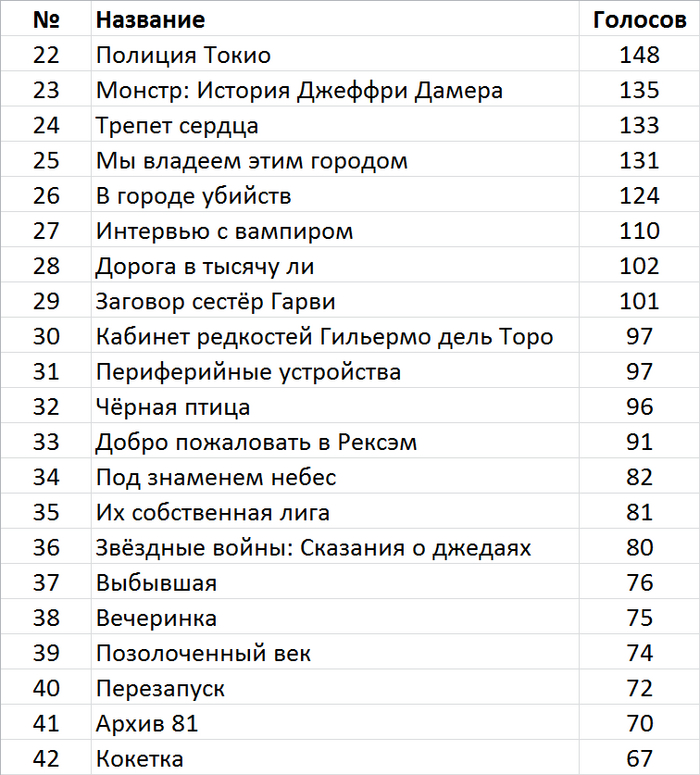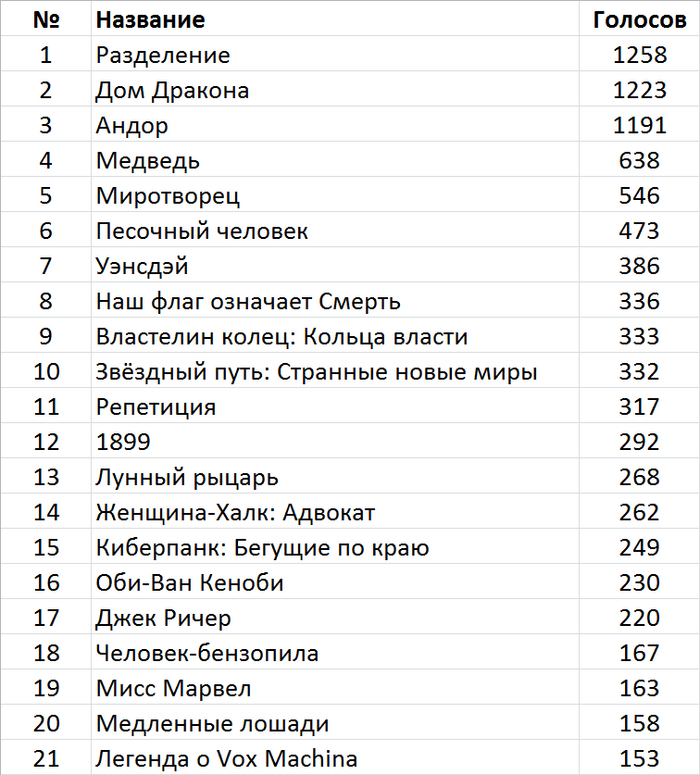 В таблице количество голосов по результатам опроса пользователей Reddit. Один пользователь при голосовании мог выбрать до 5 сериалов.