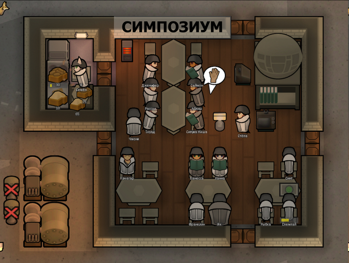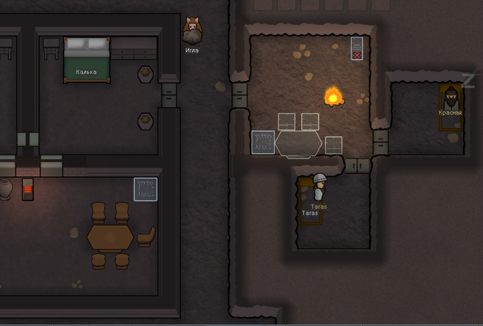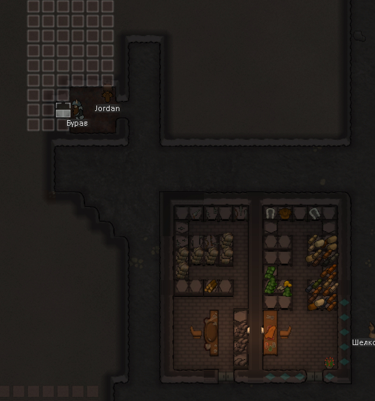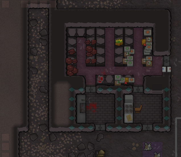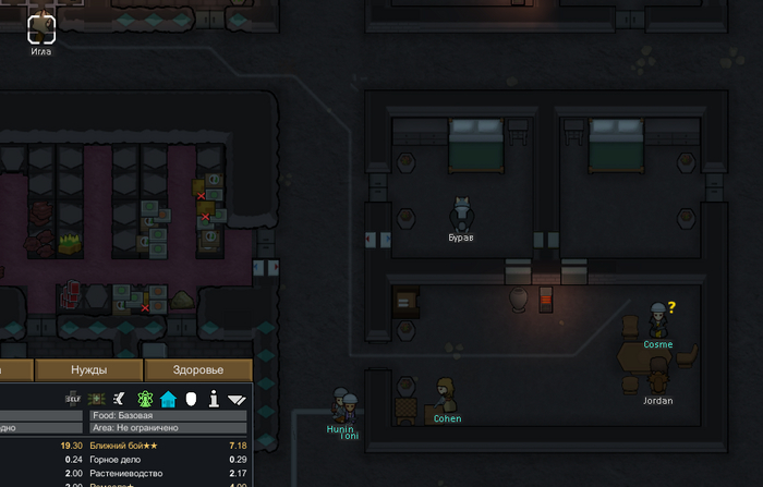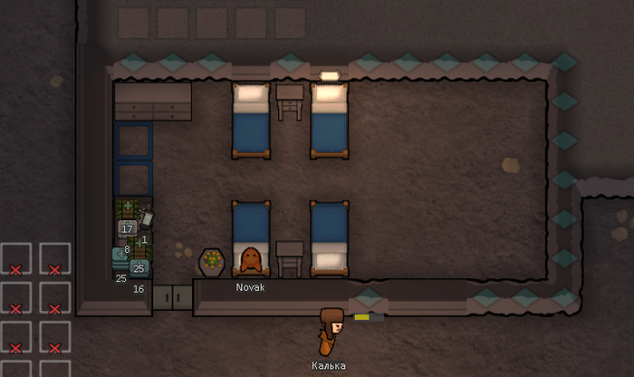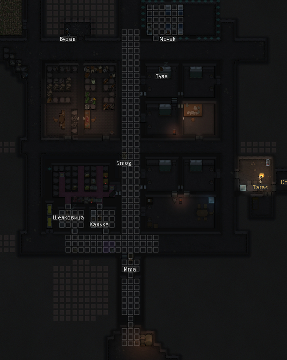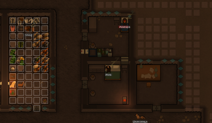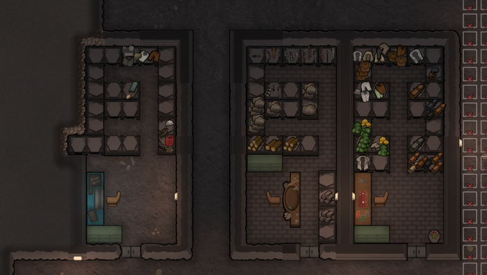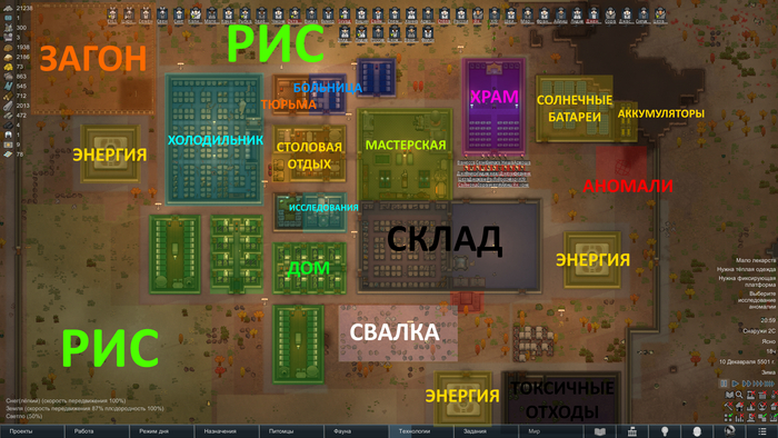 Логистика: Кухня в центре, с ней контактируют все пешки, рядом с плитой шкаф с рисом с максимальным приоритетом. Столовая нужна для +6 настроению, но её можно не делать, можно поставить стол и стулья в мастерской, чтобы не было "-ел на земле". Холодильник располагается недалеко от кухни. Тюрьма в отдельной комнате, недалеко от кухни и Больницы, в которой есть шкаф с максимальным приоритетом на медикаменты. Мастерская недалеко от кухни и склада. Гидропонные фермы размещай ближе к холодильнику. Спальни, храм, аномали, загон, Токсичный холодильник, Рисовые поля делаются где угодно, лишь бы были, если пешки умирают от голода в пути, проложи бетонное покрытие;)