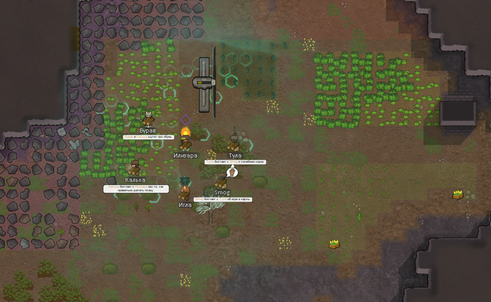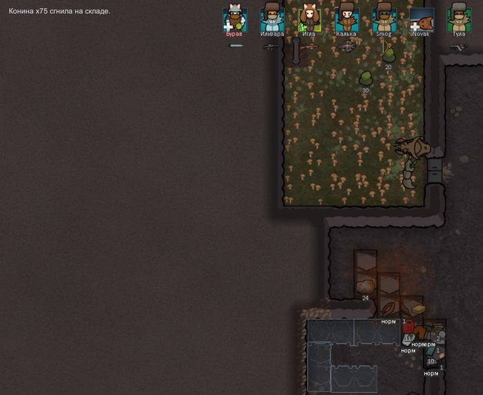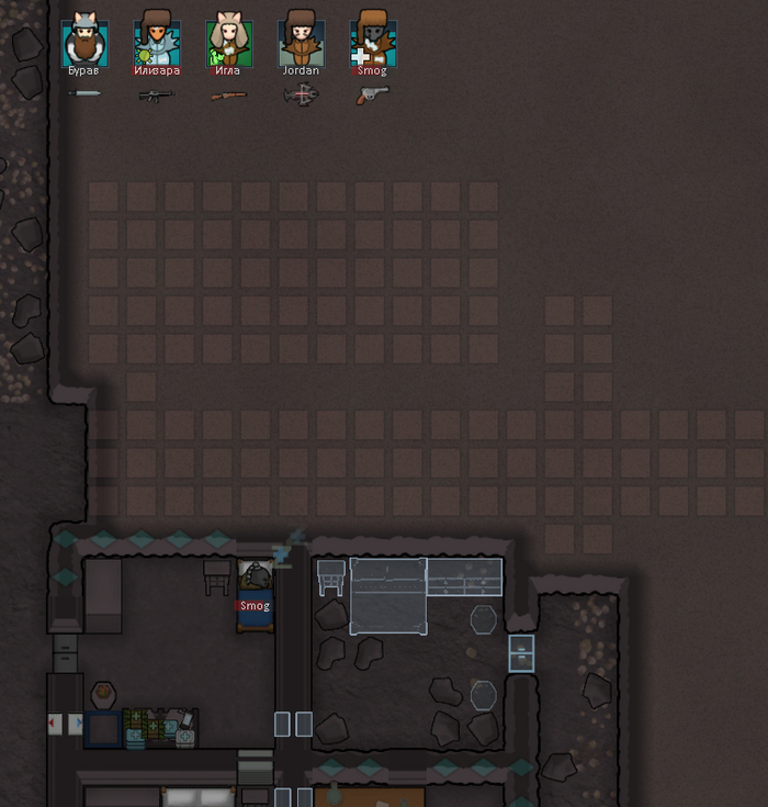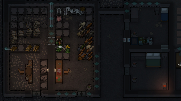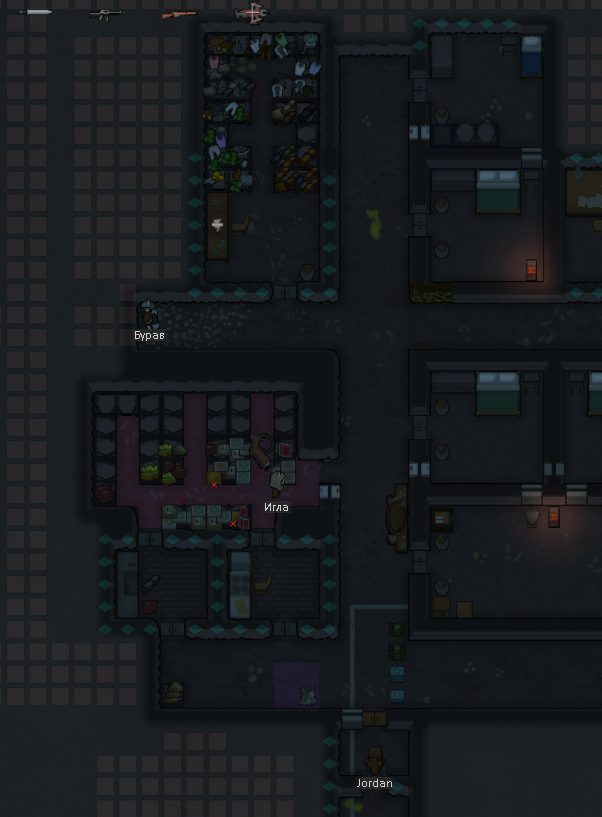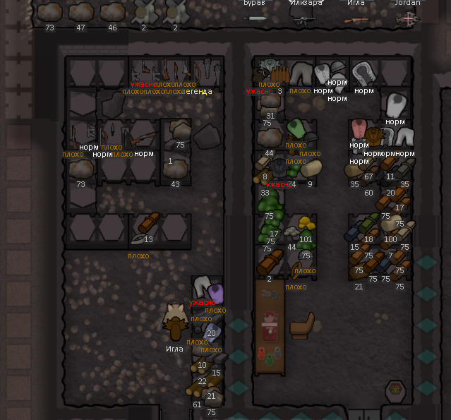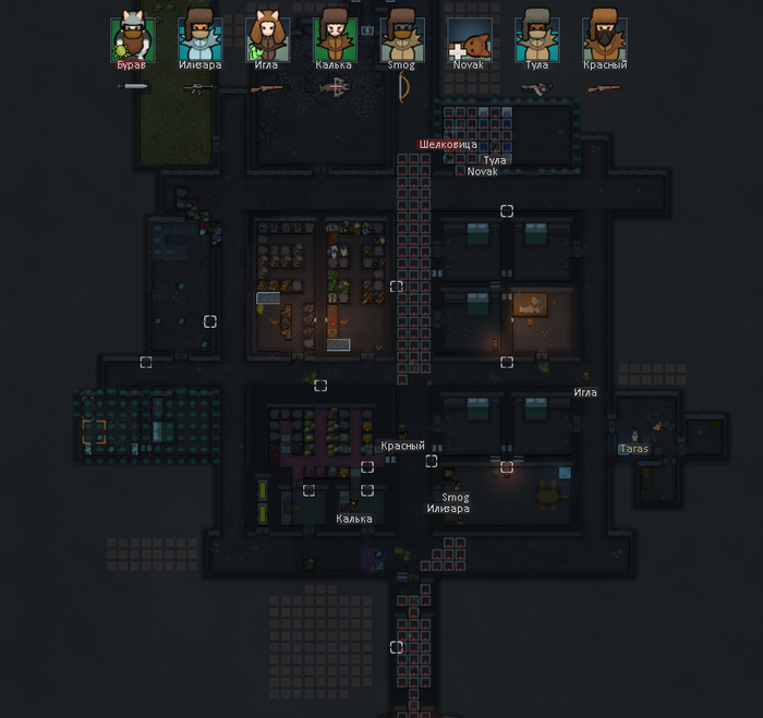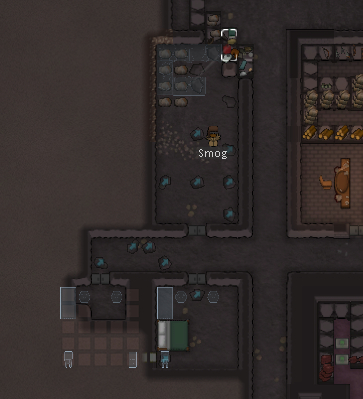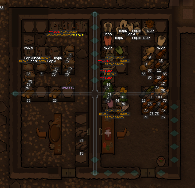 Логистика: Кухня в центре, с ней контактируют все пешки, рядом с плитой шкаф с рисом с максимальным приоритетом. Столовая нужна для +6 настроению, но её можно не делать, можно поставить стол и стулья в мастерской, чтобы не было "-ел на земле". Холодильник располагается недалеко от кухни. Тюрьма в отдельной комнате, недалеко от кухни и Больницы, в которой есть шкаф с максимальным приоритетом на медикаменты. Мастерская недалеко от кухни и склада. Гидропонные фермы размещай ближе к холодильнику. Спальни, храм, аномали, загон, Токсичный холодильник, Рисовые поля делаются где угодно, лишь бы были, если пешки умирают от голода в пути, проложи бетонное покрытие;)