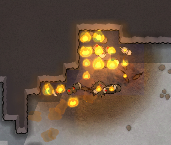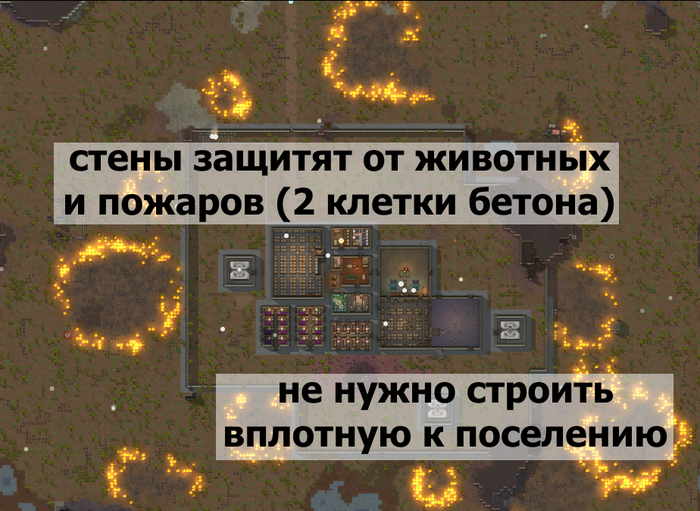 Расстояние и разделение комнат сделано по Heart's of Iron 4 - при большом расстоянии, уменьшается ущерб. Враг может приземлиться в капсулах, стрельнуть из миномёта, огнемёта, и комната буит разрушена. Чтобы не потерять всё и не строить поселение заново, лучше строиться в скале, разделять здания и делать между ними расстояние 2 клетки бетона, что не даст огню распространяться дальше.