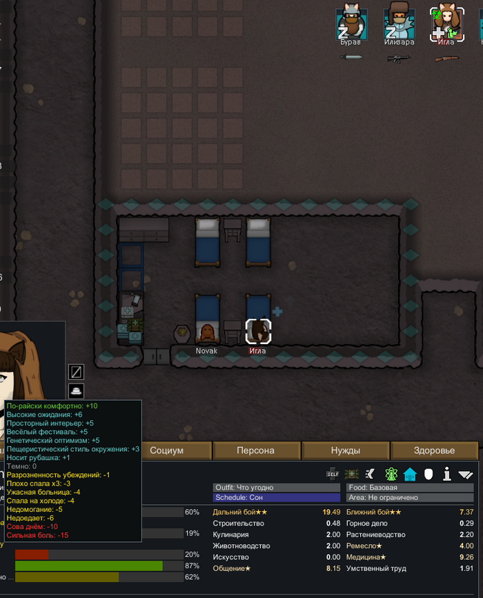 Компактность: Здесь тебе нужно задуматься - оптимизация или реалистичность/красота? Найди компромисс. Одиночной спальне достаточно 2х2 кровать, 2 большие статуи, чтобы не было "-ужасная спальня". В будущем ты забьёшь на настроение пешек и буишь делать общие спальни.