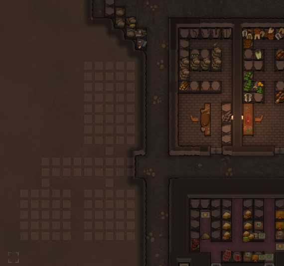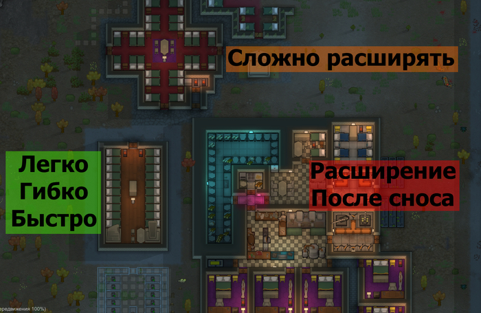 Расширение поселения: В целом ты здесь только поэтому. Расширение происходит вперёд, назад, влево, вправо. Сносить, передвигать здания не всегда оптимально, оптимальнее начать новую игру использовать то что уже есть. Не строй вокруг холодильника, пусть там буит пространство под расширение, вселенной должно хватить - не надо уменьшаться в сингулярность. В случае чего построй второй холодильник, или снеси всё что мешает! Склад без стеллажей и большим количеством предметов проще двигать. Не строй всё одним зданием так как расширяя одну комнату, ты сужаешь другую комнату. Если нужна компактность, сделай одну огромную спальню как на скрине ниже: при застройке такими "блоками", сам блок должен быть компактным, спальня 5х5 - неэффективный блок. Забей на тесноту.
