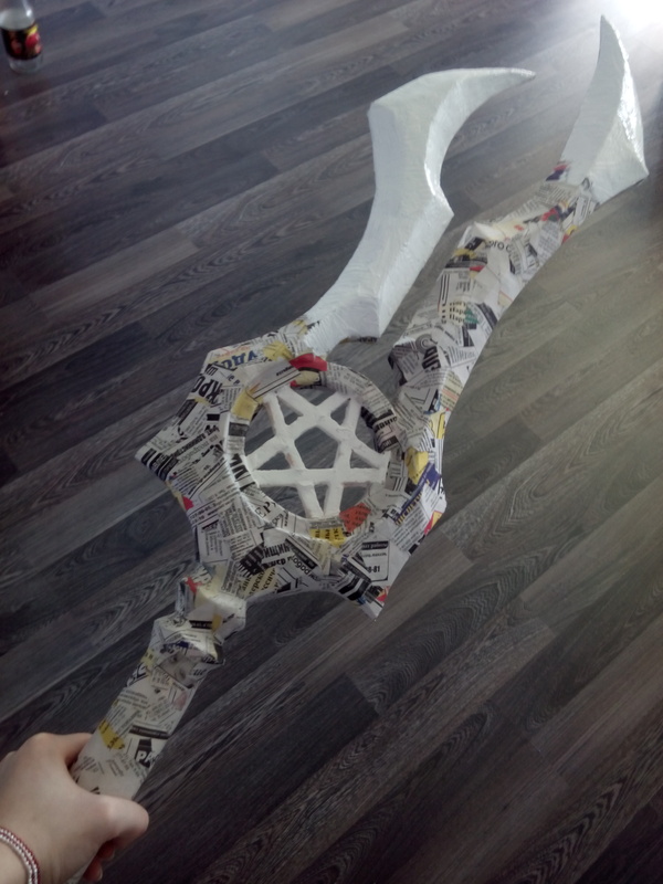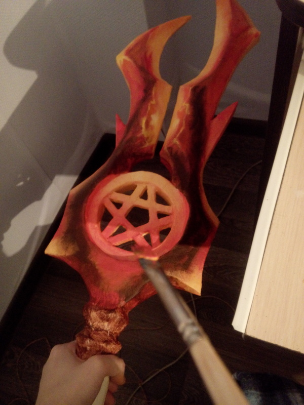 пока я красила его, вертела в руках, рукоять соскучилась и отвалилась, потом я благополучно вернула ее на место и укрепила мощным слоем клея и папье-маше :3