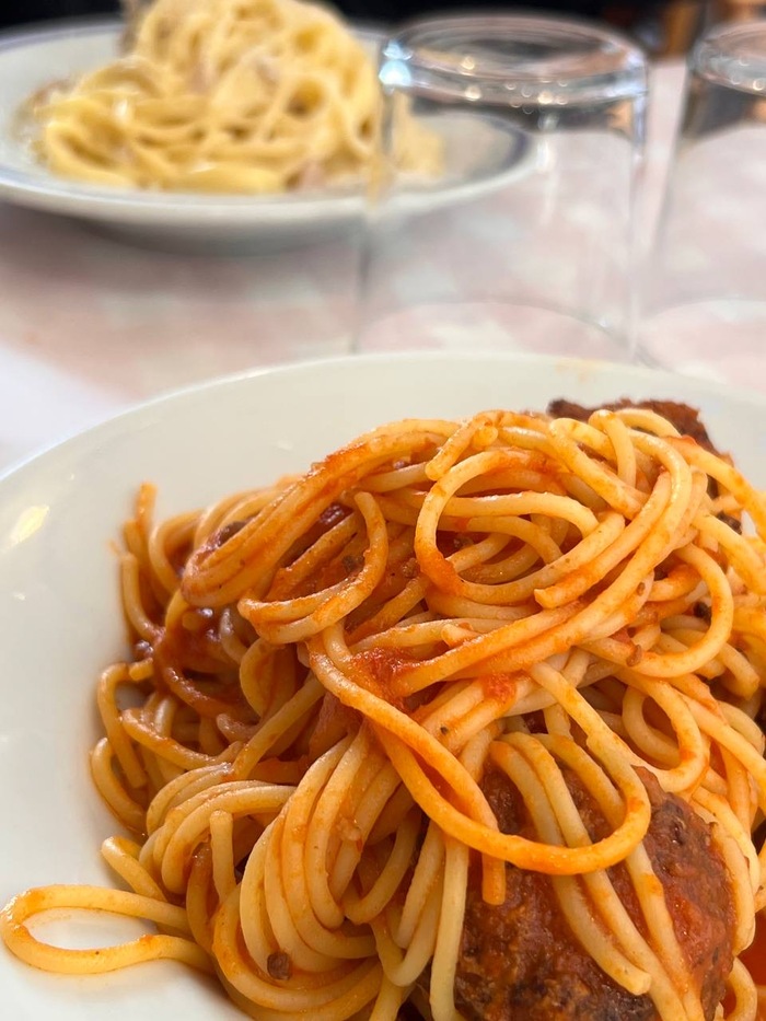 А вот и первый приём пищи в Италии. У меня была томатная паста с тефтелями, а у моего напарника Вячеслава — сливочная с курицей. Один из главных признаков для подбора заведения — это отсутствие меню на английском языке и обилие местных жителей в ресторане. А ещё лучше, если в заведении не разговаривают на английском языке. Собственно, этот ресторан соответствовал этим критериям, но паста оказалась слишком дорогой и не такой вкусной, как хотелось бы. Забегая вперёд, самую вкусную пасту мы опробовали на Пьяцца дель Пополо в старинном 90-летнем заведении.
