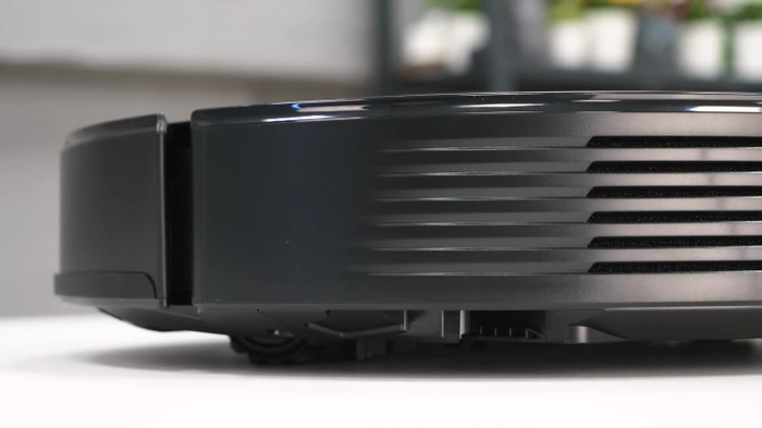 На торце нашли своё место датчики столкновения, отверстия для вывода воздуха и подвижный бампер с прорезиненной окантовкой (позволяет быть целее и пылесосу, и предметам в доме).