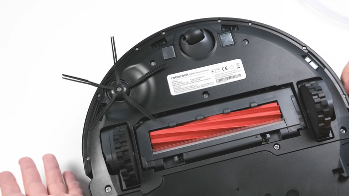 На дне разместились колёса с резиновым покрытием, датчики высоты, а также силиконовые боковая и основная щётки. По опыту владения Roborock E4, одна силиконовая лапка вполне справляется со сбором мусора и не заминается как те, что из ворса.