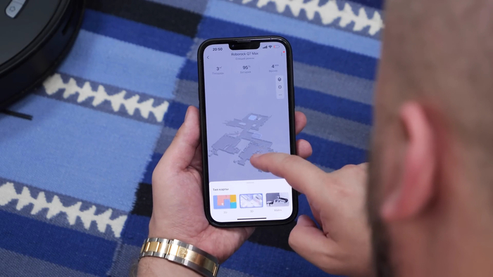 Roborock Q7 Max оснащён лазерной системой навигации PreciSense LiDAR. При первом запуске в новой обстановке пылесос построит карту пространства и разобьёт её на комнаты. В приложении можно задать запретные зоны, виртуальные стены, зоны сухой уборки, расписание уборки, а также посмотреть на карту в 3D-представлении и расставить по ней мебель. Практического смысла в последнем немного, но выглядит симпатично.