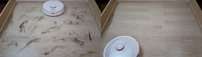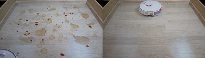 6. А вот виброшвабра - решение скорее больше похожее на маркетинговый ход. Как уже говорилось выше, подвижная площадка очень скромных размеров и во время тестирования на стенде 1.2*1.2м с засохшими пятнами соуса и кофе, роботу пришлось 20 минут ездить чтобы все оттереть. Для сравнения роботы-полотеры: Hobot Legee 7, Xiaomi SWDK ZDG300, Everybot Edge и т.д., гораздо быстрее справляются с этим заданием. За 2-3 проезд по стенду они отирают все пятна (а это 4-5 минут работы). Так что вибрирующий модуль - это точно не та причина, по которой нужно покупать Roborock S7.