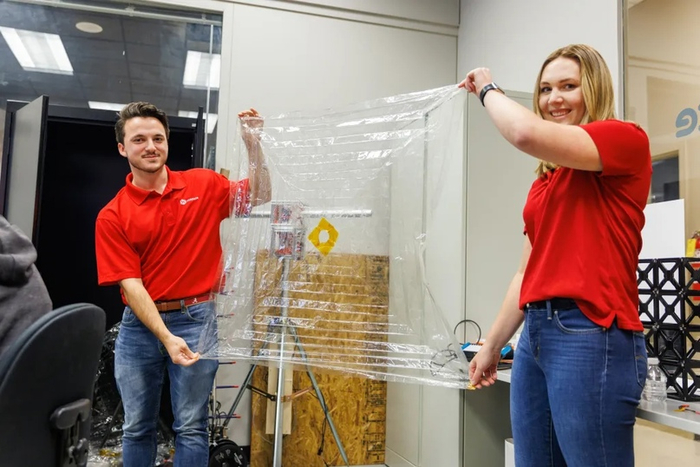 Чет Уилтшир (руководитель группы управления и обработки данных) и Эбби Фидер (менеджер проекта) держат прозрачный майларовый парус площадью 1 м2 перед установкой. (Предоставлено: Университет Алабамы)