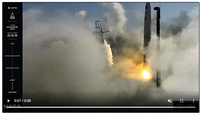 Видеозапись запуска LV0006 Astra и отказа системы быстрого отсоединения, что привело к потере одного двигателя. (Источник: кадры предоставлены NASASpaceflight LLC и Astra Space Inc. )