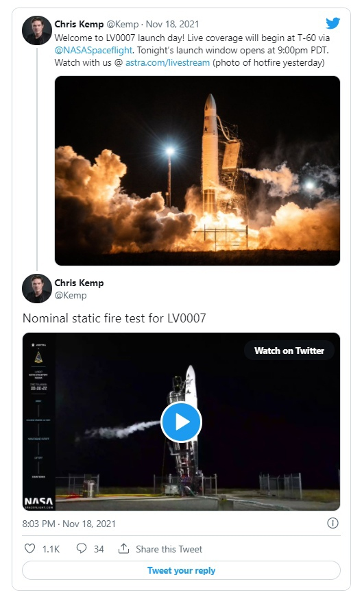 Стартап пусковой компании Smallsat Astra Space должен предпринять еще одну попытку выйти на орбиту уже в четверг вечером. «Пусковое окно» LV0007 открывается в 21:00 по тихоокеанскому стандартному времени 18 ноября (в 05:00 по Гринвичу 19 ноября). Резервная дата запуска 19 ноября по тихоокеанскому стандартному времени (20 ноября по всемирному координированному времени). Запуск будет производиться со стартовой площадки LP-3B на комплексе Тихоокеанского космодрома в Кадьяке, Аляска.