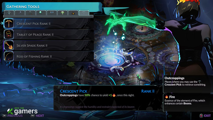 В локациях вы будете находить руду, места для рыбалки и раскопок. Чтобы собирать все это добро, нужны Инструменты ночи. Они открываются через заклинание «Ночная работа» в котле, для которого нужен всего 1 цветок Моли (растет в самой первой локации). Сделайте это сразу же! В отличие от раннего доступа, теперь все инструменты всегда с вами, и вы не будете упускать драгоценные ресурсы в каждом забеге.