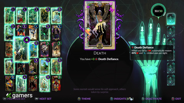 Вернувшись на базу после первого забега, идите в тренировочную зону и активируйте Алтарь пепла. Там вы откроете Карты Арканы — местный аналог прокачки. Первое, на что нужно потратить Пепел, — карта «Смерть». Она дает вам заряды «Вызова смерти» — способности, которая воскрешает вас прямо в бою с 40% здоровья. Это важнейшее улучшение для выживания.