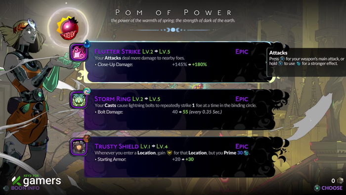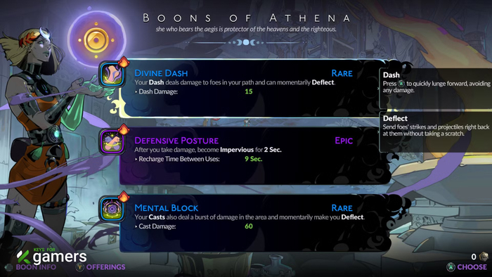 В игре шесть видов оружия, и у каждого свой стиль. Важно понимать: некоторые Дары богов просто созданы для одного оружия, но бесполезны для другого. Например, дар Гестии, поджигающий врагов при каждой Особой атаке, — мусор для медленной секиры, но превращает быстрые парные клинки в машину для убийств. Так что не бойтесь экспериментировать и думать, какая способность лучше всего дополнит ваш текущий ствол.