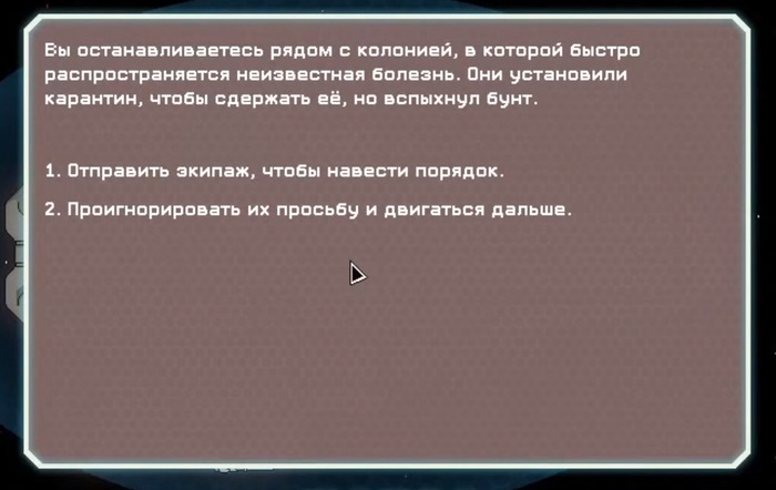 Колония на карантине, неизвестная болезнь, бунт. Не, мы туда не полезем, а то еще весь экипаж умрет в первом же секторе (было как то раз уже так). Летим дальше.