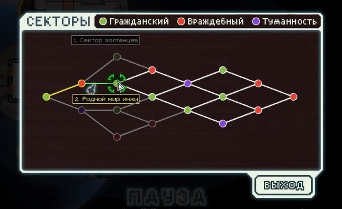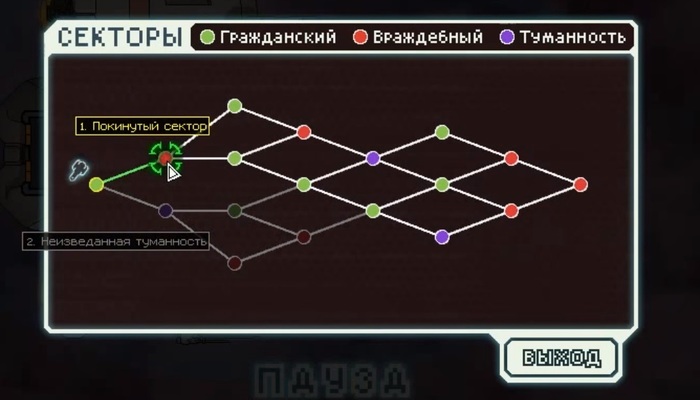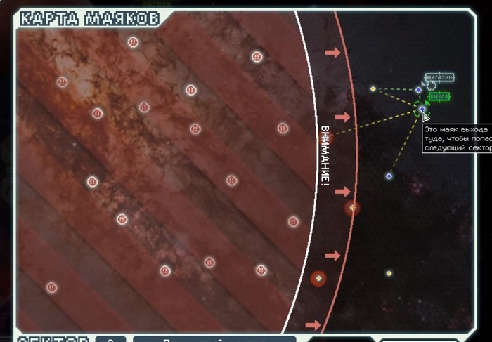 Через еще несколько скачком по системам и парочкой потасовок с пиратами мы наконец добрались до выхода в соседний сектор. Туманность или враждебный сектор? Мой выбор враждебный сектор. Не люблю туманности. Там половина модулей бывает не работает. К черту их.