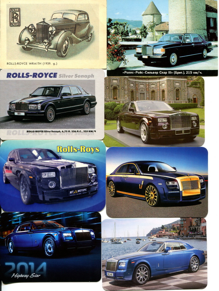 Седьмой календарь выпущен в серии "Автопанорама" в 2013 году (есть даже точная дата - 31 июля) ООО "ХАТБЕР-М"(г. Москва), сетка на 2014 год.На календаре показан Rolls-Royce Phantom VII поколения с кузовом купе (2008-2016)..Восьмой календарь - часть серии, выпущенной в 2014 году полиграфическим центром ATPrint (г. Днепропетровск, Украина).На календаре показан такой же Phantom VII поколения с кузовом купе, что и на седьмом календаре.