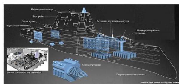 Многие элементы надстройки хотя и выглядят под краской металлическими, но на самом деле выполнены из дерева (бальсы и пенополистирола) для снижения ЭПР и облегчения надстройки (иначе остойчивость такого высокого корабля получалась совсем плохая). Ну и так далее — идея делать артиллерийский корабль для обстрела врага с дистанции в 200 км вызвала необходимость малой ЭПР (чтобы затруднить врагу наведение), затем дистанция досягаемости снизилась и снижение ЭПР перестало помогать, а затем, когда перешли на ракеты и дистанция боя резко возросла — оказалось, что вся затея с низкой ЭПР была бессмысленна, но корабль-то уже построили! И ведь строили его с упором на атаки береговых и наземных целей — поэтому остальные системы у него сделаны «по остаточному принципу». Вот и плавает этот утюг памятником несбывшимся мечтам. Идея была смелая — но технологии оказались современным США уже не по зубам.
