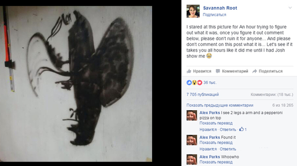 Как стало известно, фотографию картины опубликовала на своей странице Саванна Рут (Savannah Root) из города Ламар в американском штате Миссури. По словам девушки, она около часа вглядывалась в изображение в попытках понять, что же на ней нарисовано. В результате ей удалось рассмотреть замысел художника, и она решила поделиться картиной со всеми пользователями сети.Спустя некоторое время под изображением собралось более 36 тысяч лайков и более 18 тысяч комментариев. Здесь многие гадали, что же изображено на рисунке. Некоторые сообщили, что увидели две ноги и пиццу, другие заявляли, что на картине запечатлено некое существо, похожее на ящерицу, третьи и вовсе видели птицу.