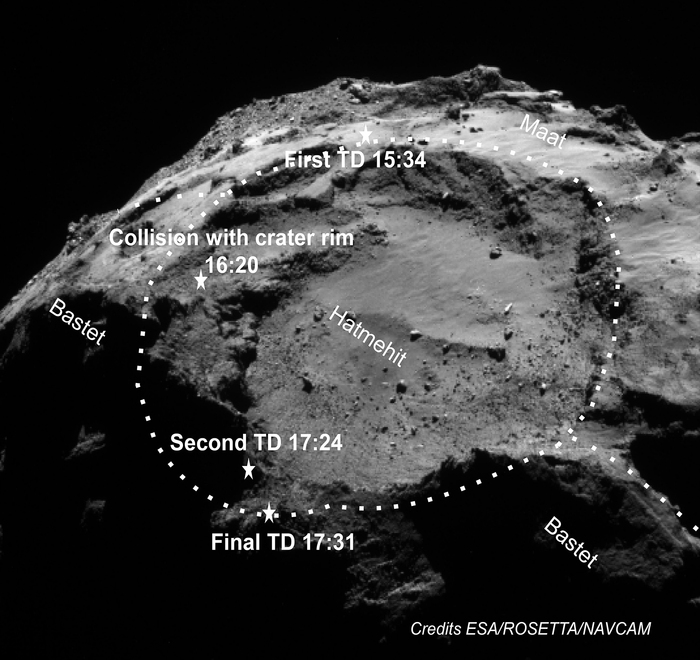 По данным телеметрии аппарат произвел три касания поверхности кометы и в итоге произвёл посадку неоптимальным образом: он оказался на склоне кратера с углом наклона 30°, но в остальном аппарат пережил посадку без значительных повреждений.