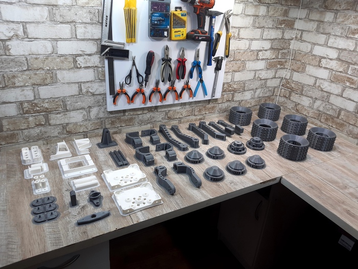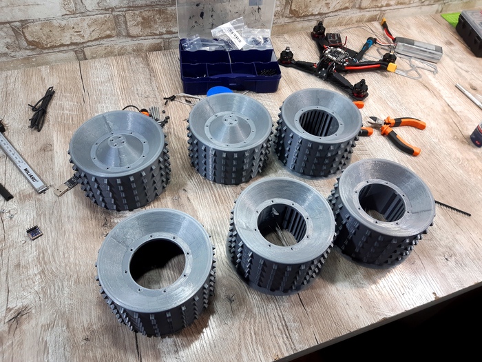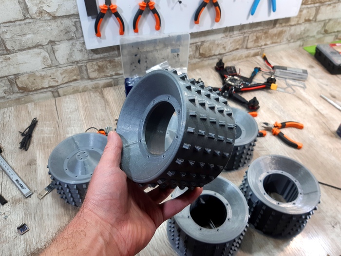 Все печатные детали напечатаны PLA пластиком от Bestfilament. Заполнение для колёс стоит выставить минимальное, в районе 10%. Для декоративных деталей, вроде камер и спектрометра – по усмотрению, там много не надо. А вот для ступиц, рычагов подвески, хаба и его основания – 50–75%. Для печатных деталей корпуса (уголков) достаточно 30%.