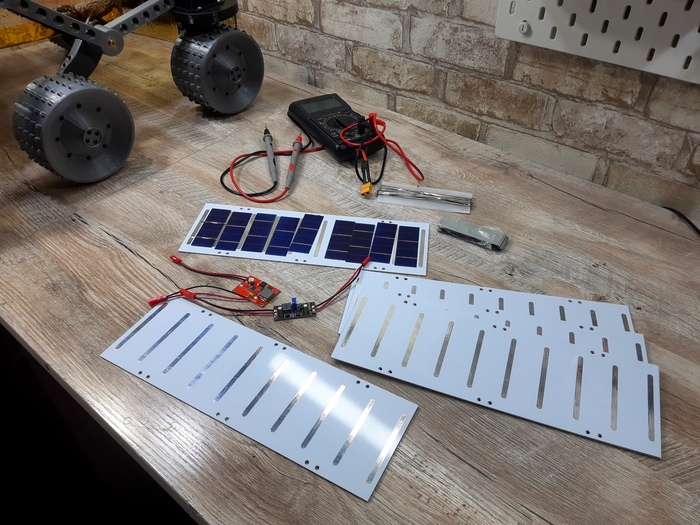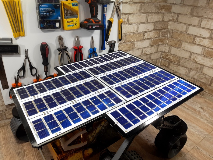 Солнечная панель собрана из 72 элементов. Каркас вырезан из оргстекла. В качестве основы для элементов я попробовал использовать печатные платы, изготовленные на заказ у JLCPCB. И что-то в этом определённо есть, так можно минимизировать весь солнечных панелей. Буду дальше работать в этом направлении. Ровер был собран зимой, так что её толком ещё не тестил, жду лета.